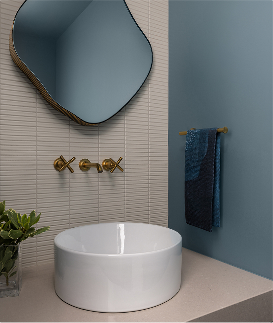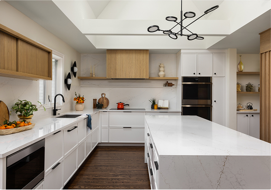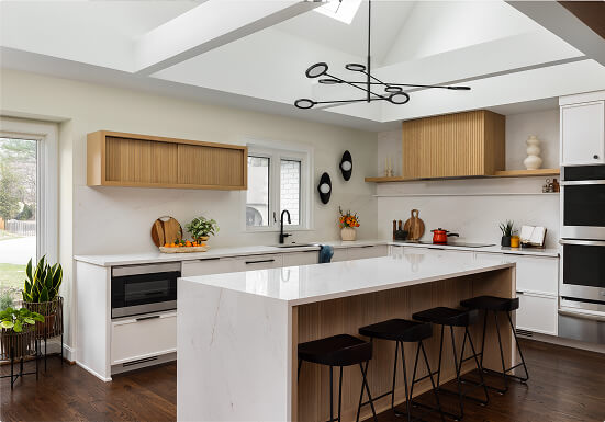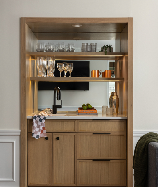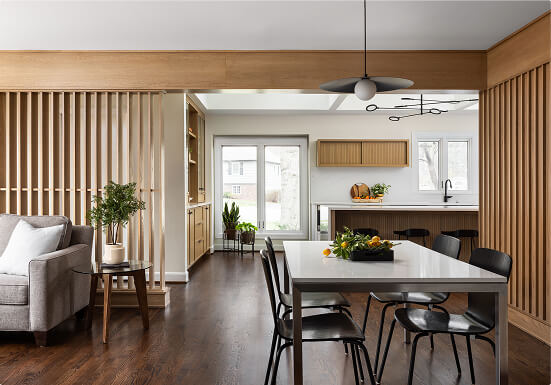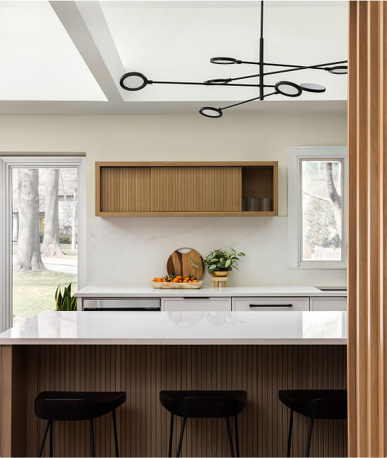 One of the standout features is the custom wood slat screen that now gently separates the kitchen from the family’s cozy den. Paired with a new textured wood wall paneling, it preserves the warmth and character of the original space while tying it into the updated design. The result is a home that feels more open, more livable, and perfectly tailored to how the family lives today.